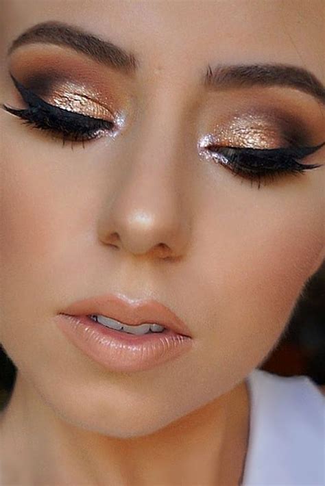 Embrace the opulent beauty of gold with a glamorous eye look. Start with a champagne eyeshadow base and add a touch of gold shimmer to the center of the lid, blending it outwards. Line your eyes with a gold liquid eyeliner and finish with a few coats of mascara.